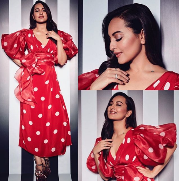 اختارت الممثلة الهنديه سوناكشي سينها إطلاله فريده للترويج لصيحه البولكا دوت حيث ارتدت فستان باللون الأحمر الزاهي بنقاط البولكا البيضاء مع حزام عريض من نفس الفستان حول منطقه الخصر الأمر الذي اظهر رشاقتها.