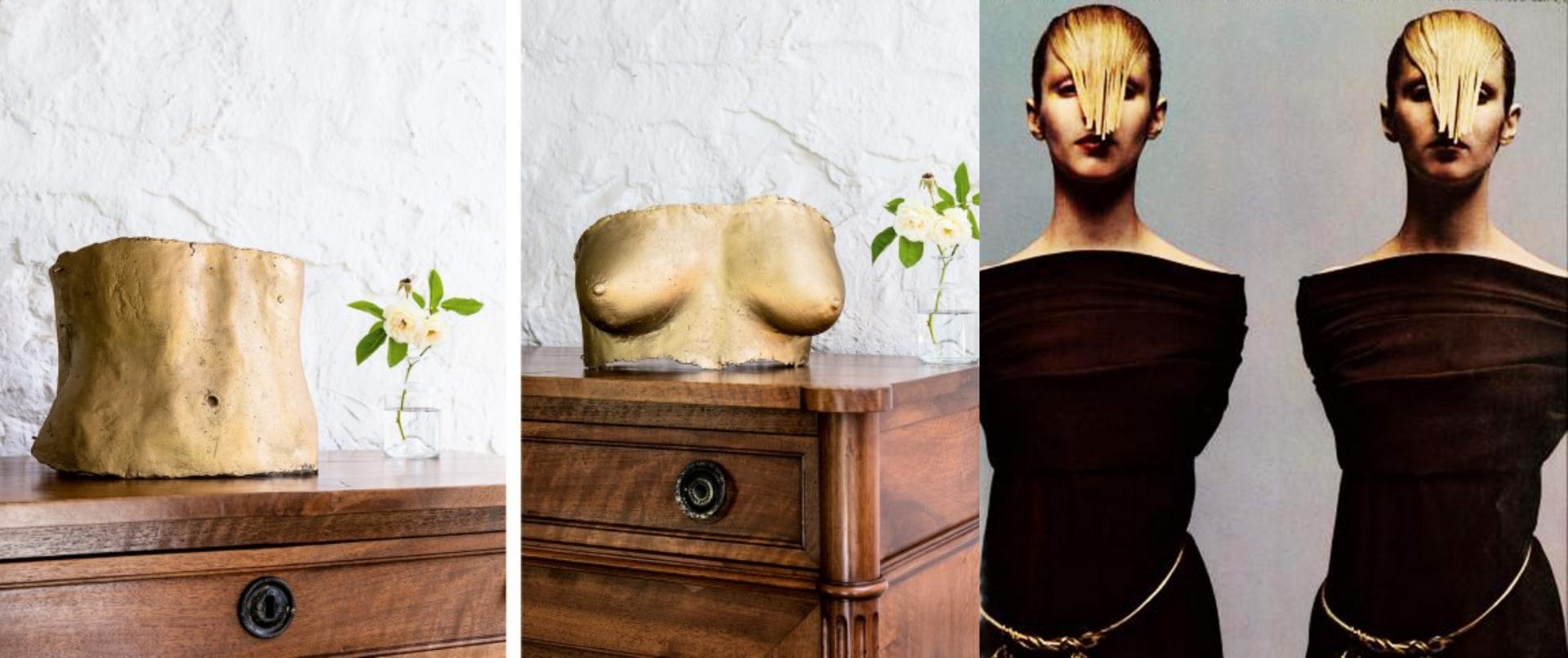 اما بالنسبة للتمثال النصفي المصبوب ( الصدرية) مع اللون الازرق فبدا انه حلم من القوة وسمو الفن الناعم والخفيف. استطاع انتوني فاكاريللو وفريقنا في سان لوران من العودة إلى الارشيف ودمج جمالية اعمال كلاود مع مجموعة صيف ٢١ فظهرت الجميلة كيكي ويليامز مرتدية صدرية ذهبية اللون منسقة بشكل رائع مع جاكيت دوبل بريستيد اسود اللون .