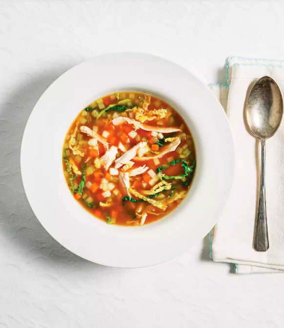 - يُضاف الدجاج والجزر والكرفس ويُترك على نار متوسطة مع التحريك من حين لآخر حتى تنضج الخضروات، لمدة 8 دقائق تقريبًا.