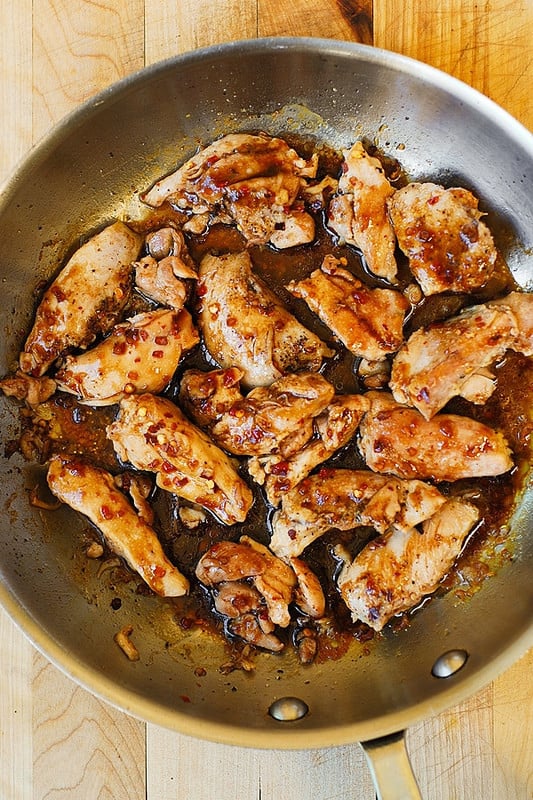 6. يُطهى المزيج حتى يصبح الدجاج ورديًا والعصائر صافية. (حوالي 15 دقيقة)