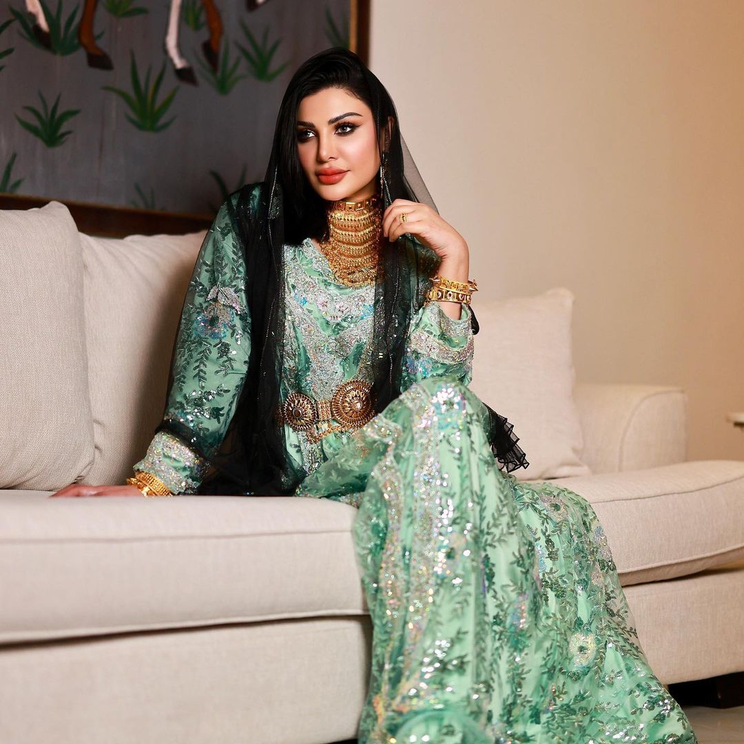 شاركت الفنانة الكويتية عبر حسابها الخاص في انستقرام صور جديدة لها ظهرت فيها بإطلالة رمضانية تتناسب مع الشهر الفضيل، وارتدت العوضي فستان طويل بأكمام من اللون التركواز مليء بالتطريزات والزركشات فضية اللون