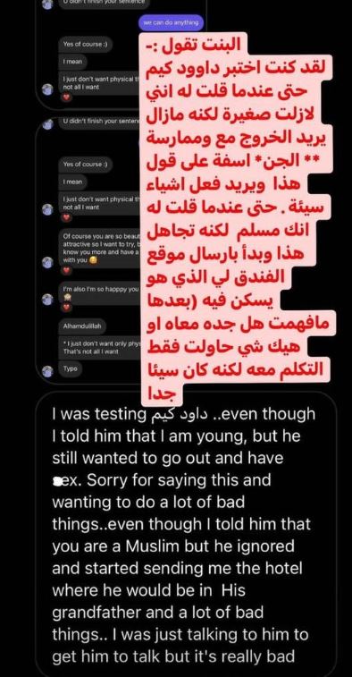 وخلال المحادثة طلب منها اليوتيوبر داوود كيم زيارته في غرفته داخل الفندق غير مبالي بعمرها متجاهلًا سؤالها له أنه مسلم ولا يجب القيام بأي أمر حرام