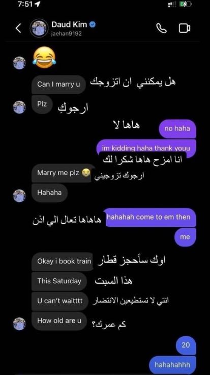 ونشرت عدد من الصفحات تفاصيل المحادثة مع الفتاة التي قالت إنها قررت اختبار اليوتيوبر الكوري وحقيقة اسلامه، حيث راسلته مؤكدة أنها مقيمة في السعودية وأنها قاصر