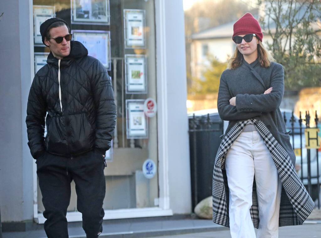وارتدت النجمة البريطانية البالغة من العمر 30 عامًا، معطفًا طويلاً رماديًا وسراولًا أبيض، فيما ارتدى مات سترة سوداء "ووتر بروف" مع سروال أسود أيضًا.