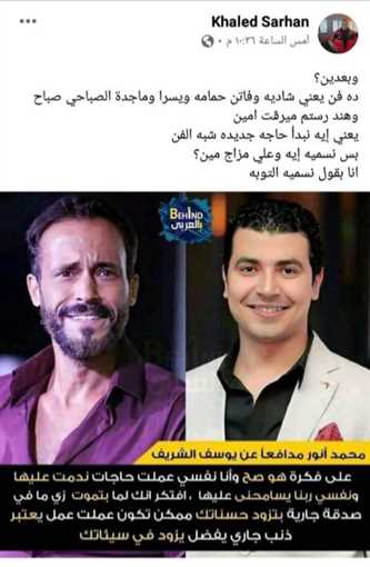 ونشر سرحان عبر حسابه الشخصي على "فيس بوك"، نص حديث الفنان الشاب محمد أنور الذي دافع فيه عن يوسف الشريف قائلًا: "على فكرة بقى هو صح والله العظيم وأنا نفسي اللي لسه ببدأ عملت حاجات وندمت إني عملتها ونفسي ربنا يسامحني عليهان افتكر إنك لما بتموت وأنت سايب صدقة جارية بتنفعك في قبرك وتزود حسناتك، ممكن كمان تعمل عمل يعتبر ذنب جاري وبعد ما تموت يفضل يزود سيئاتك".