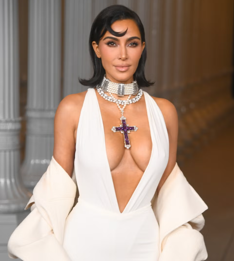 أما كيم فقد حرصت على تقصيرها، حيث ارتدت معها قلادة لؤلؤ من Tallarico وقلادة من الماس واللؤلؤ من Bulgari. كما نسقت كيم كارداشيان الإطلالة مع معطف أبيض طويل.