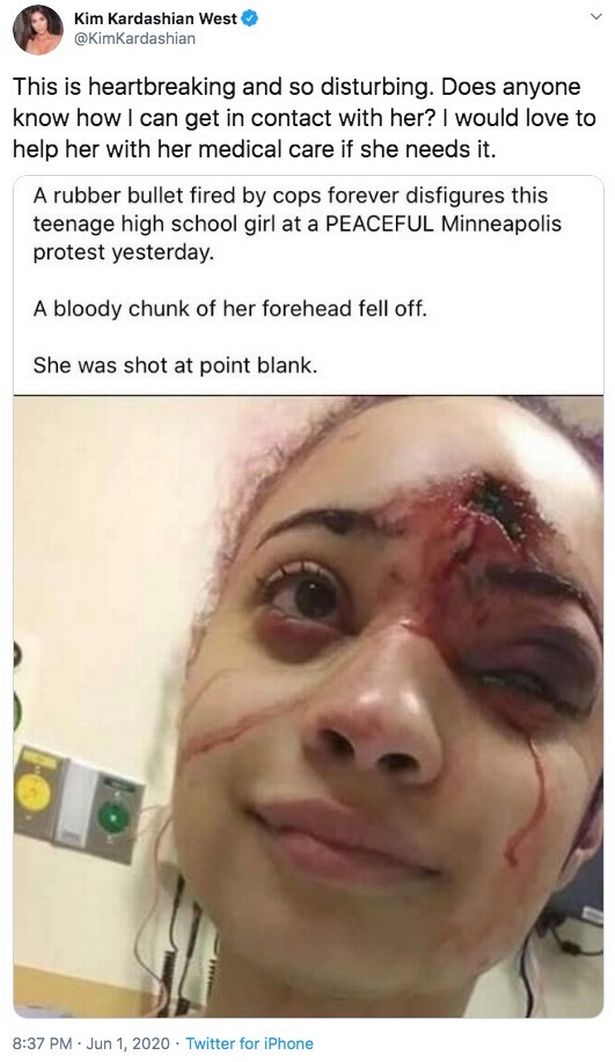نتقلت نجمة تلفزيون الواقع الأمريكية، كيم كارداشيان إلى وسائل الإعلام الاجتماعية للتعبير عن رعبها بعد رؤية صور "مفجعة" لمتظاهرة شابة أصيبت من مسافة قريبة برصاصة مطاطية بوجهها.