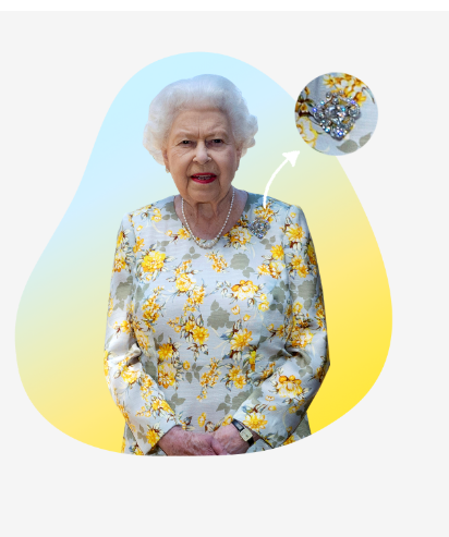 وارتدت الملكة بروش Cullinan V ، وهو ماسة على شكل قلب 18.8 قيراط مرصعة بالبلاتين ومحاطة بقطعة من الماس مرارًا، وفقًا لمجلة "فانتي فير".