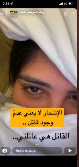 كما نشرت السويلمي صورة تظهر فيها منهارة وكتبت عليها: "الانتحار لا يعني عدم وجود قاتل.. القاتل هي عائلتي"