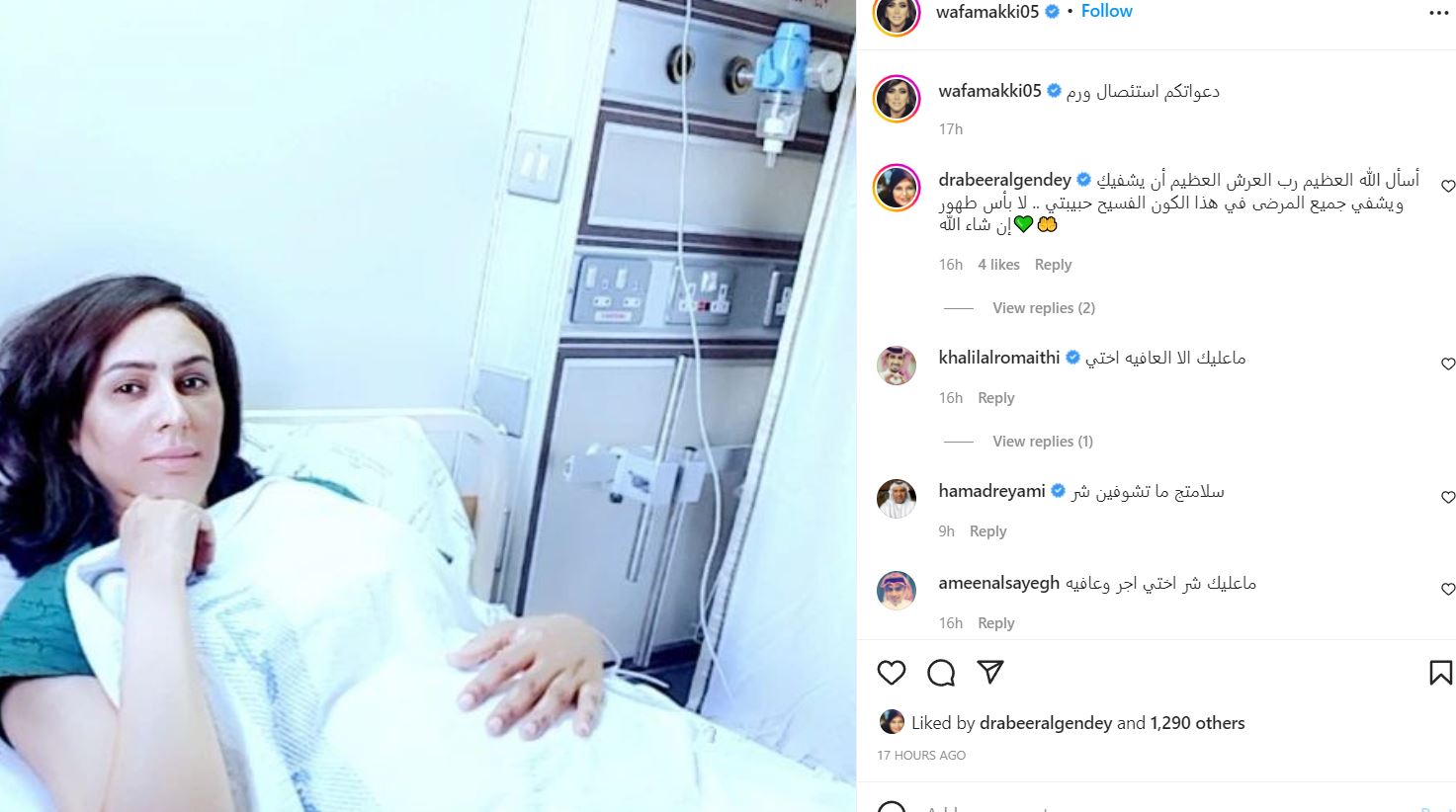 نشرت الفنانة البحرينية وفاء مكي عبر حسابها الخاص في موقع التواصل الاجتماعي انستغرام صورة لها من داخل المستشفى وهي على سرير الشفاء كاشفة عن اصابتها بورم
