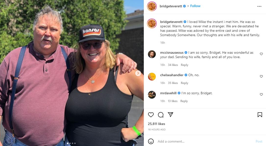 وفي منشور اخر نشرت النجمة بريدجيت صورة تجمعها بالفنان الراحل وقالت: "لقد أحببت مايك في اللحظة التي قابلته فيها. لقد كان مميزًا جدًا. دافئ، مضحك، شعرنا بالصدمة بسبب وفاته، كان مايك محبوبًا من قبل طاقم الممثلين وطاقم مسلسل شخص ما في مكان ما"