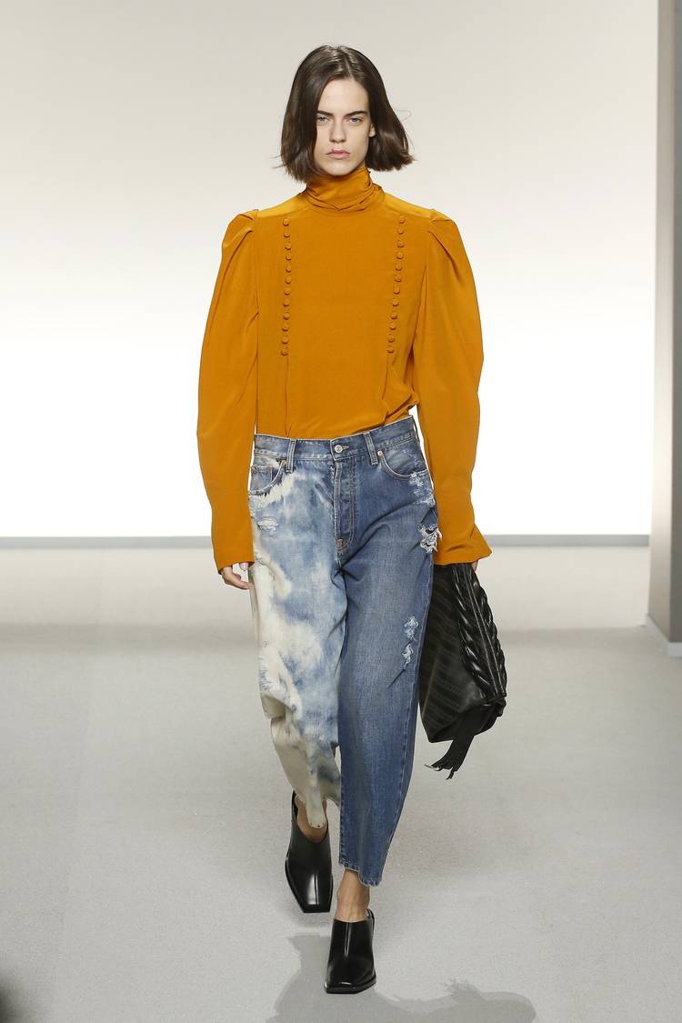 درجة مميزة من البرتقالي وليست زاهية بصورة مبالغ فيها، وبدلًا من الاضطرار لارتداء أكثر من طبقة، اختاري بلوزة ذات رقبة عالية واكمام فضفاضة بعض الشيء، لاسيما ذات التصميم المنتفخ مثل الواضح بالصورة، ونسقيها مع بنطلون جينز واسع ذا درجة فاتحة من الأزرق وأكملي اطلالتك بحذاء وحقيبة باللون الأسود.