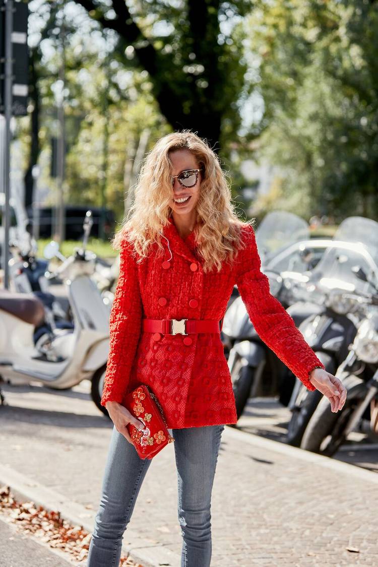 بدلا من اختيار الأسود أو البني وغيره من الألوان الداكنة المعتادة، اختاري معطف باللون الأحمر المشع ونسقيه مع بنطلون جينز من اختيارك، ويمكنك اكمال اطلالتك بحذاء كعب أو بوت كاحل باللون النيود أو الأسود أو الأحمر على غرار المعطف.
