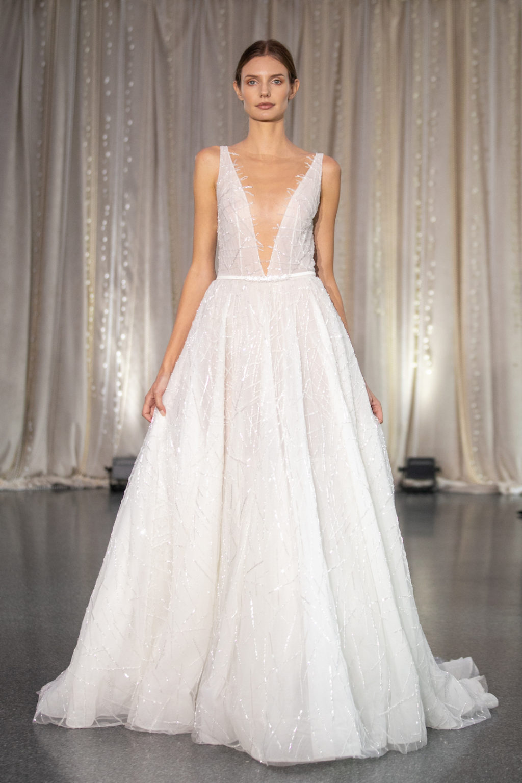 لا تخفت صيحة اللمعان أبدًا في موضة فساتين الزفاف، غير أننا شهدنا هذا الموسم استخدام أشكالٍ جديدة من الترتر التقليدي والخرز، بدءًا من تصميم زخرفة المرآة وحتى المنسوجات اللامعة بالكامل.