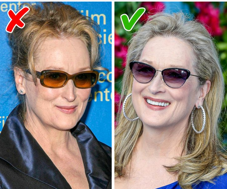يمكن للنظارات الشمسية المختارة أن تضيف لعمرك بعض سنوات، على سبيل المثال، يمكن لنظارات cat-eye glasses أن تصحح مشكلة الزوايا الخارجية المنخفضة للعين و تجعلك تبدين أصغر سنًا.