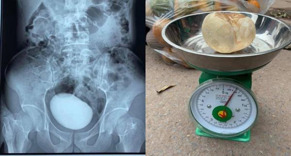 اجرى الاطباء فحص بالاشعة المقطعية و اظهرت الاشعة وجود كتلة ضخمة مستديرة في مثانة السيدة التي تبلغ من العمر 34 عامًا وبالفعل تمكن الأطباء من إزالة الحصوة التي يزيد طولها عن 10 سم وتزن 400 غرامًا.