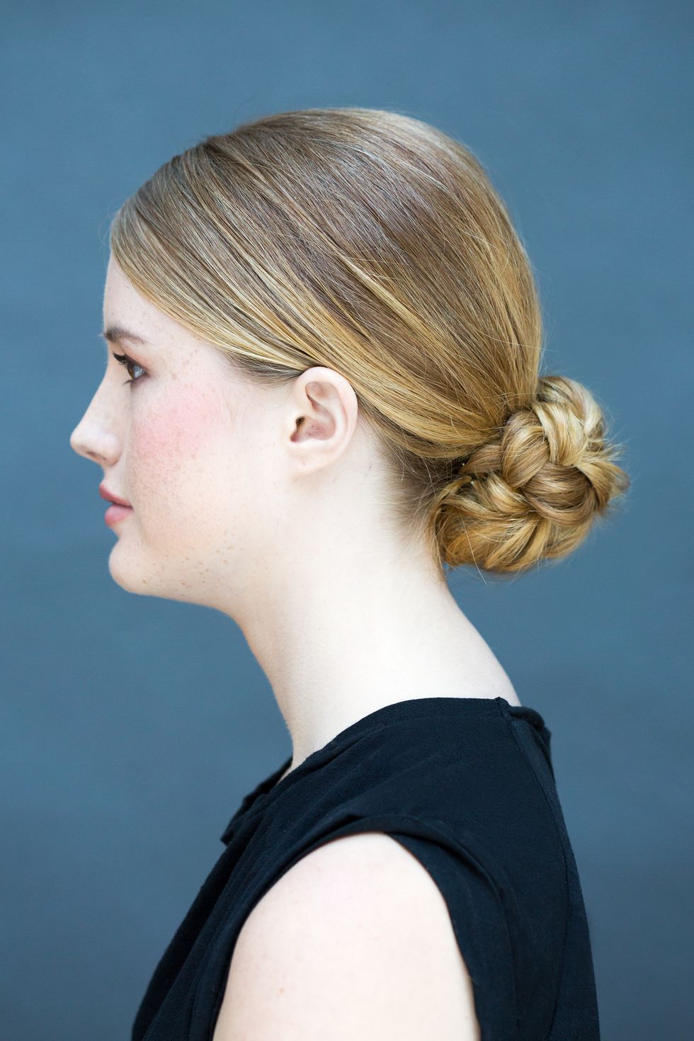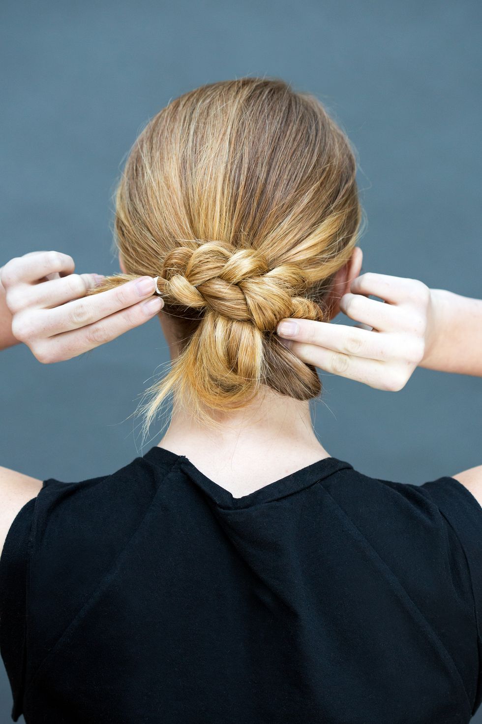 قومي بربط شعرك بهيئة ذيل حصان منخفض ثم قومي بتضفير الشعر ثم لف الضفيرة على شكل الكعكة وتثبيتها بدبابيس الشعر.