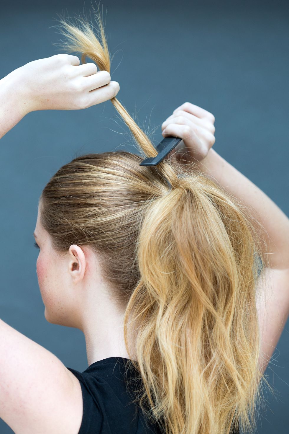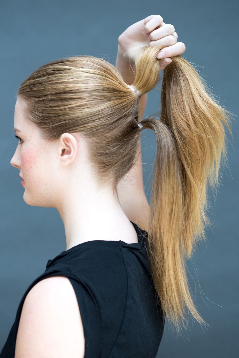 كل ما عليكِ هو ان تقومي بتقسيم شعرك إلى جزئين من الخلف ثم عمل ذيل حصان في الجزء العلوي وذيل حصان في الجزء السفلي وبعدها يمكنك إستخدام مشط باسنان ضيقة من اجل إظهار الجزئين كأنهم شئ واحد.