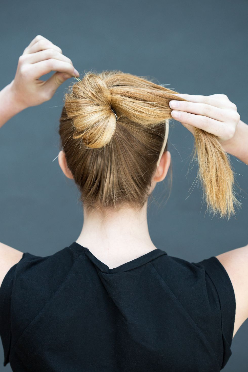 يمكنكِ ببساطة رفع الشعر بتسريحة ذيل الحصان بإستخدام توكة صغيرة ثم فومي بلف الشعر على هيئة كعكعة ثم ثبتيها بإستخدام دبابيس الشعر الصغيرة وبعدها بإستخدام عصا خشبية او قلم نجذب اطراف الكعكعة من كل الجوانب حتى نضيف حجم اكبر للشعر.