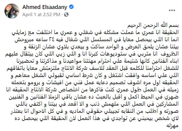 السعدني لم يذكر اسم الفنانة، إلا أن مصادرنا أشارت إلى أنها الفنانة زينة التي تشاركه بطولة المسلسل.