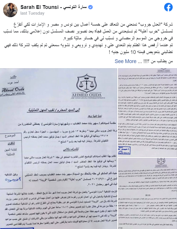 وفقًا لادعاءات الجهة المنتجة،هاجمت سارة المنتج جمال العدل، بعد تصريحه بطردها من المسلسل، وتحول الأمر إلى صراع قضائي.