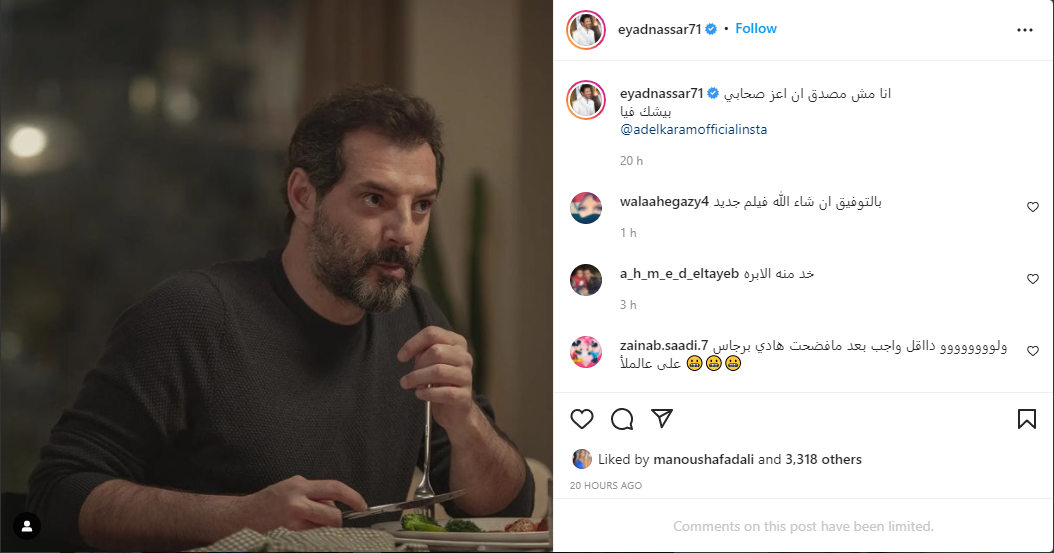 بينما نشر إياد نصار صورة الفنان اللبناني عادل كرم وكتب: "انا مش مصدق ان اعز صحابي بيشك فيا".