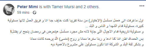 وقال مخرج مسلسل الاختيار، في منشور عبر حسابه بموقع "فيسبوك": "اول ماعرفت انى هعمل مسلسل (الاختيار) من سنة تقريبا كنت خايف جدا انا و فريق العمل لانها مسئولية كبيرة، مسئولية قدام الشهدا و الناس و البلد".