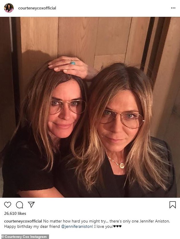 وفي وقت لاحق، نشرت "كورتني كوكس" صورة تجمعها بـ"جينيفر" عبر حسابها على موقع "إنستغرام"، حيث بدت الصديقتان نسخة طبق الأصل، فارتدت "كوكس" شعر مستعار أشقر ونظارة طبية ذات عدسات كبيرة، كما اختارتا إطلالتين مُتطابقتين باللون الأسود، وعلَّقت: " بغض النظر عن محاولاتك الجاهدة.. هناك فقط جينيفر أنيستون واحدة.. كل عام وأنت بخير صديقتي العزيزة. "