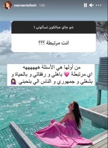 نشرت الفنانة السورية نسرين طافش عبر "ستوري" حسابها الرسمي على انستغرام "شو جاي عالبالكون تسألوني" رغبةً منها في التواصل مع جمهورها.
